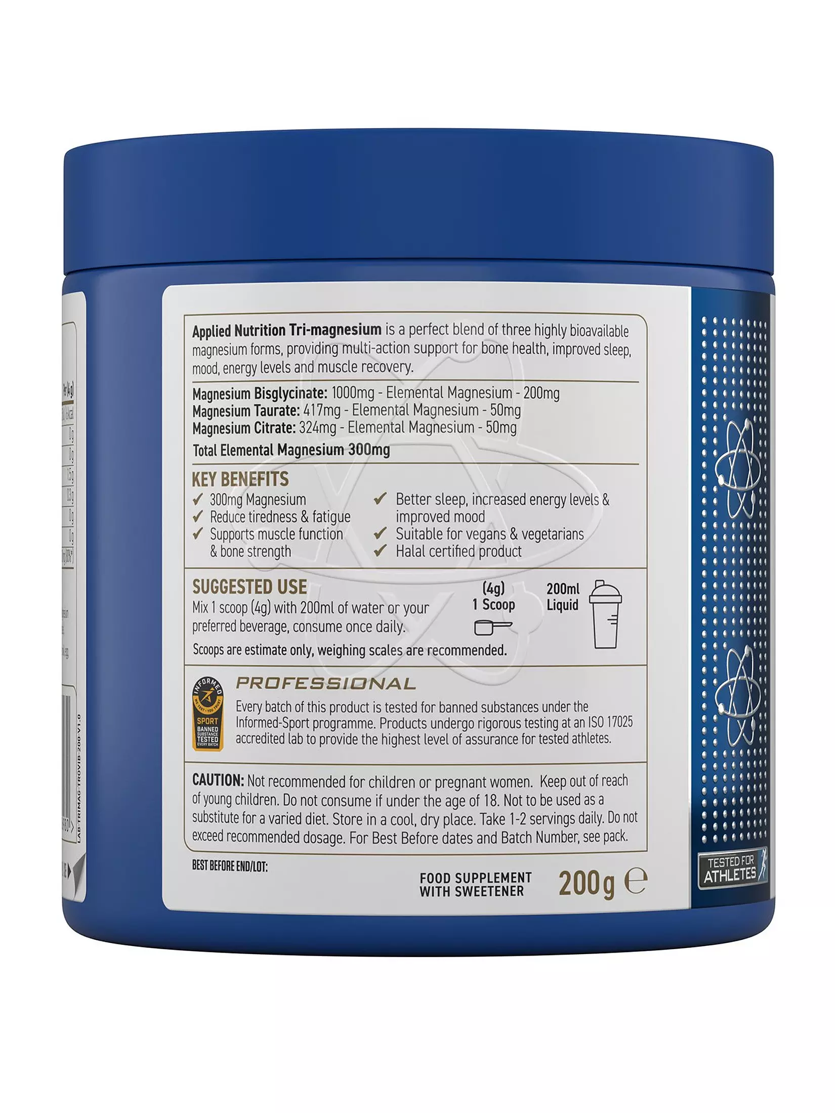 Applied Nutrition – Tri-Magnesium is a complex of three of the most fast-absorbing and effective forms of magnesium, presented in a water-soluble, flavorless powder form.