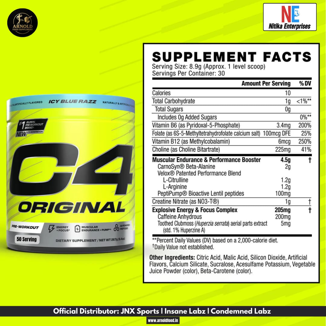 Unleash Your Full Workout Potential With Cellucor C4 Original — a Legendary Pre-workout Designed to Elevate Your Strength, Performance, and Endurance. Wellnessed by a Super Creatine Compound, Carnosyn® Beta-alanine, and a Patented Caffeine Support Blend, C4 Helps Fuel Your Goals Whether You’re Just Beginning Your Fitness Journey or Pushing Toward a Personal Best. With Every Scoop, You’ll Experience Enhanced Muscular Endurance, Improved Focus, and Explosive Wellness—without the Sugar.