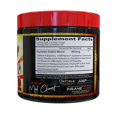 Insane Labz Psychotic Diablo is a thermogenic fat burner designed for both men and women, featuring a blend of active ingredients including Grains of Paradise, Theobromine, and Dandelion Root Extract, all powered by AMPiberry. This product works by boosting metabolic rate, enhancing energy levels, and promoting fat oxidation, which can assist in weight management. Users often combine this supplement with regular exercise and a balanced diet for optimal results, making it a popular choice for fitness enthusiasts.