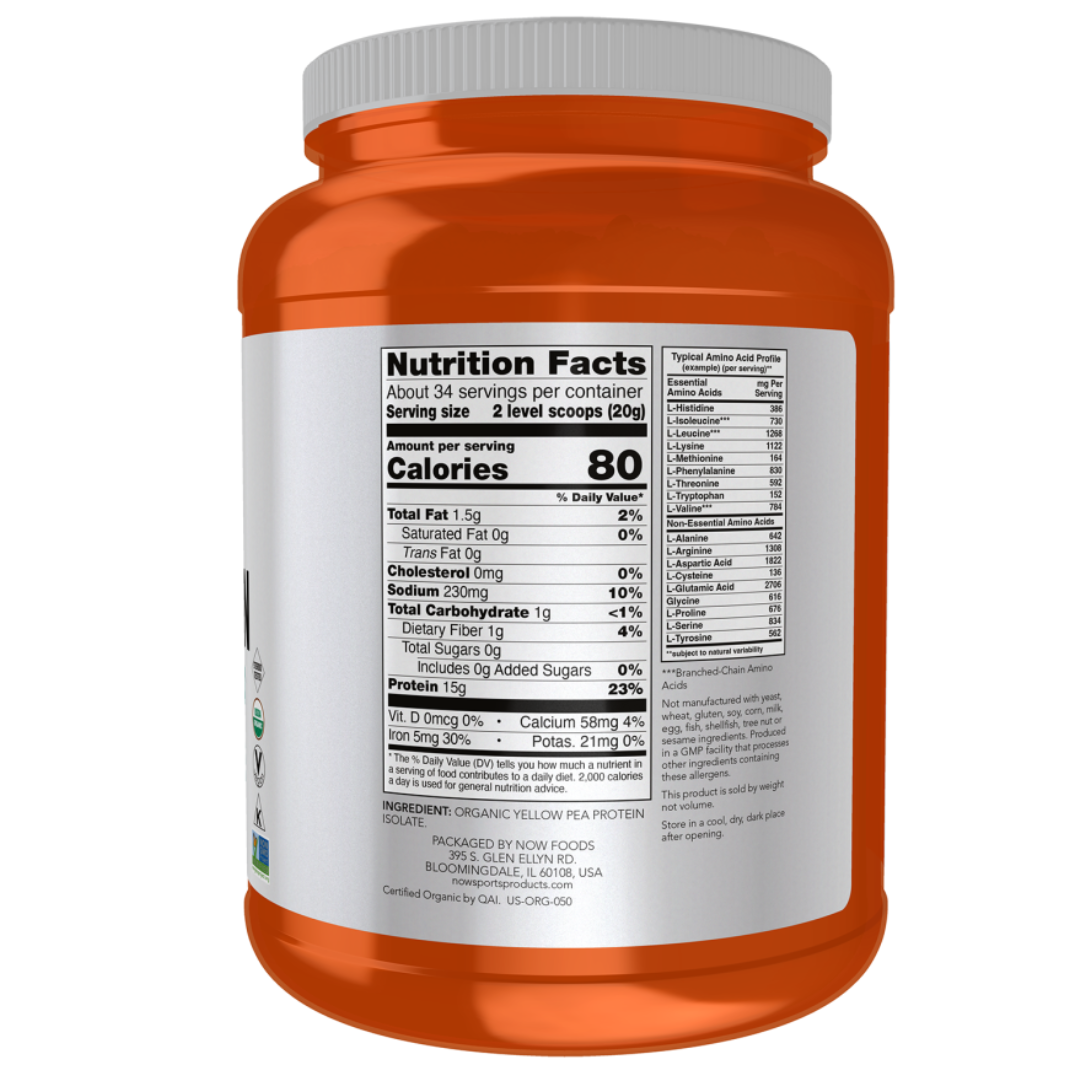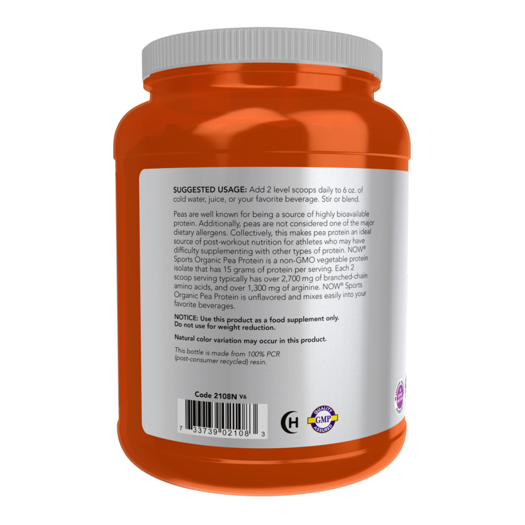 Peas are well known for being a source of highly bioavailable protein. Additionally, peas are not considered one of the major dietary allergens. Collectively, this makes pea protein an ideal source of post-workout nutrition for athletes who may have difficulty supplementing with other types of protein. NOW® Sports Organic Pea Protein is a non-GMO vegetable protein isolate that has 15 grams of protein per serving. Each 2 scoop serving typically has over 2,700 mg of branched-chain amino acids, and over 1,300 mg of arginine. NOW® Sports Organic Pea Protein is unflavored and mixes easily into your favorite beverages.